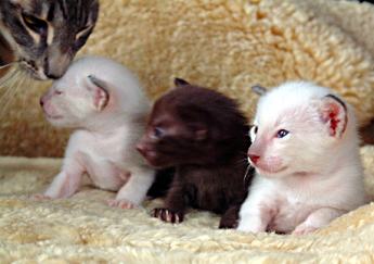 OKH-Würfen oft Siambabys, die scheeweiß geboren werden. Bei den beiden äußeren Babys erkennt man bereits die Ausfärbung der Siam-Farbe sealpoint deutlich an den schwarzen Ohrrändern, während erst eine
